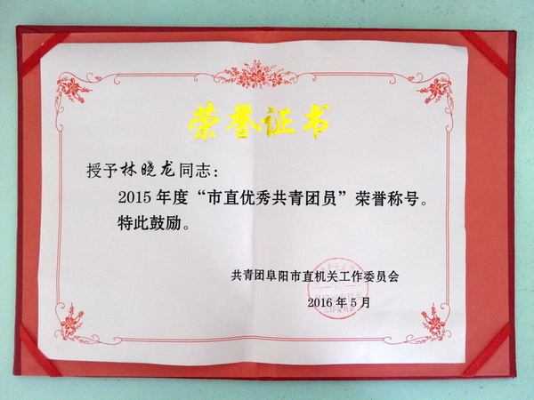 日前,阜陽市鹽務局鹽政科稽查隊員林曉龍被共青團阜陽市委授予“2015年度市直優秀共青團員”榮譽稱號。