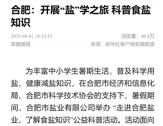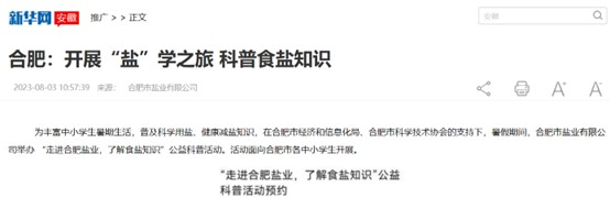 2023年7月,合肥鹽業(yè)自1950年成立以來首次對外開放,面向全市中小學(xué)生,開展“鹽”學(xué)之旅,食鹽科普游活動,活動內(nèi)容包括參觀60年歷史的鐵路專用線、省市食鹽儲備倉庫,食鹽健康科普講座,7月份接待來自國內(nèi)外7所中小學(xué)校170名學(xué)生和家長,8月份已預(yù)約8場食鹽科普游。