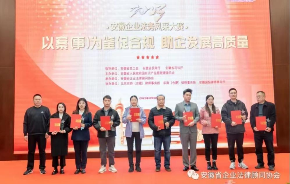 2023年11月15日上午,由安徽省總工會、安徽省民政廳、安徽省司法廳指導,安徽省人民政府國有資產監督管理委員會主辦,安徽省企業法律顧問協會承辦的“2023年安徽企業法務風采大賽”在合肥成功舉辦。本次大賽主題是“以案(事)為鑒促合規,助企發展高質量”,共征集征文、PPT、微視頻等法治作品155篇(部)。